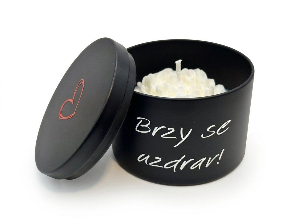 Svíčka s vlastním textem a květinou v plechovce - kolekce láska